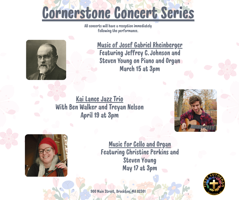 First Evangelical Lutheran Church is located at 900 Main Street in Brockton. You can find a map on the “How to Find Us” page. The funny thing is, in spite of our impressive front church entrance, we are what you might call back door people. Go around to the back of the church and you’ll find plenty of parking and an entranceway via a canopied area. You can enter there, come up a few steps, or follow the instructions to a nearby elevator. There, you will see a hallway with several of us visiting and ushers distributing worship bulletins. Enter the church and sit wherever you feel most comfortable. And, if you feel like it, come downstairs after church and join us for some refreshments/